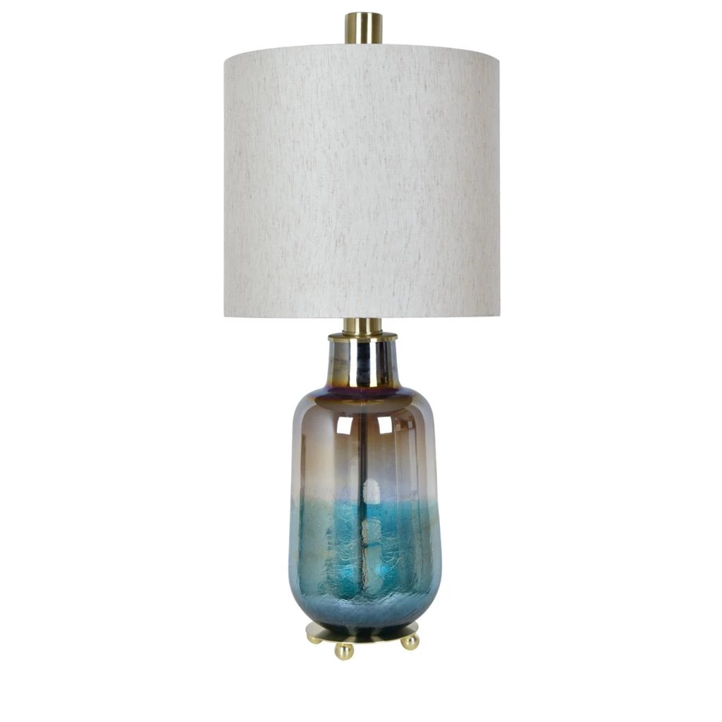 - Created with iridescent teal glass and an antique, brass finish, this table lamp is sleek and sure to make a statement