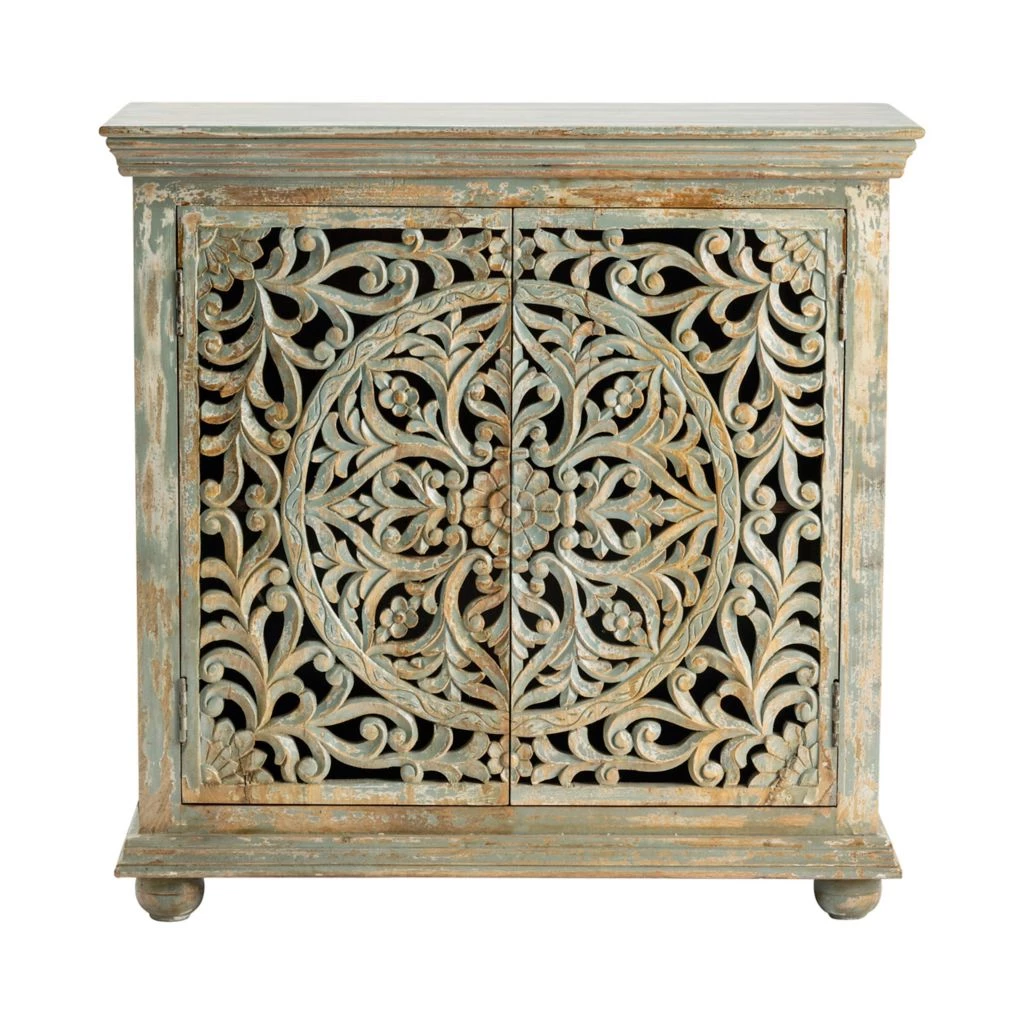 - Carved cabinet features 2 doors with beautifully integrated carved design