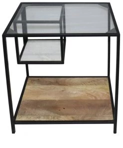 - Mixed material chairside table combines rustic and contemporary to fit seamlessly into any decor