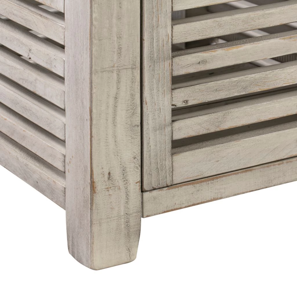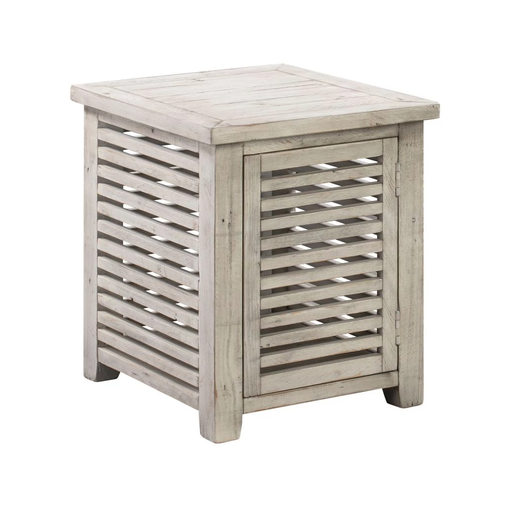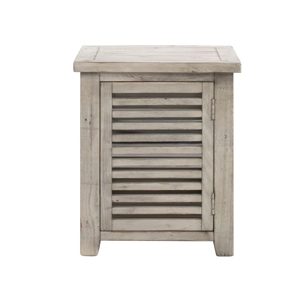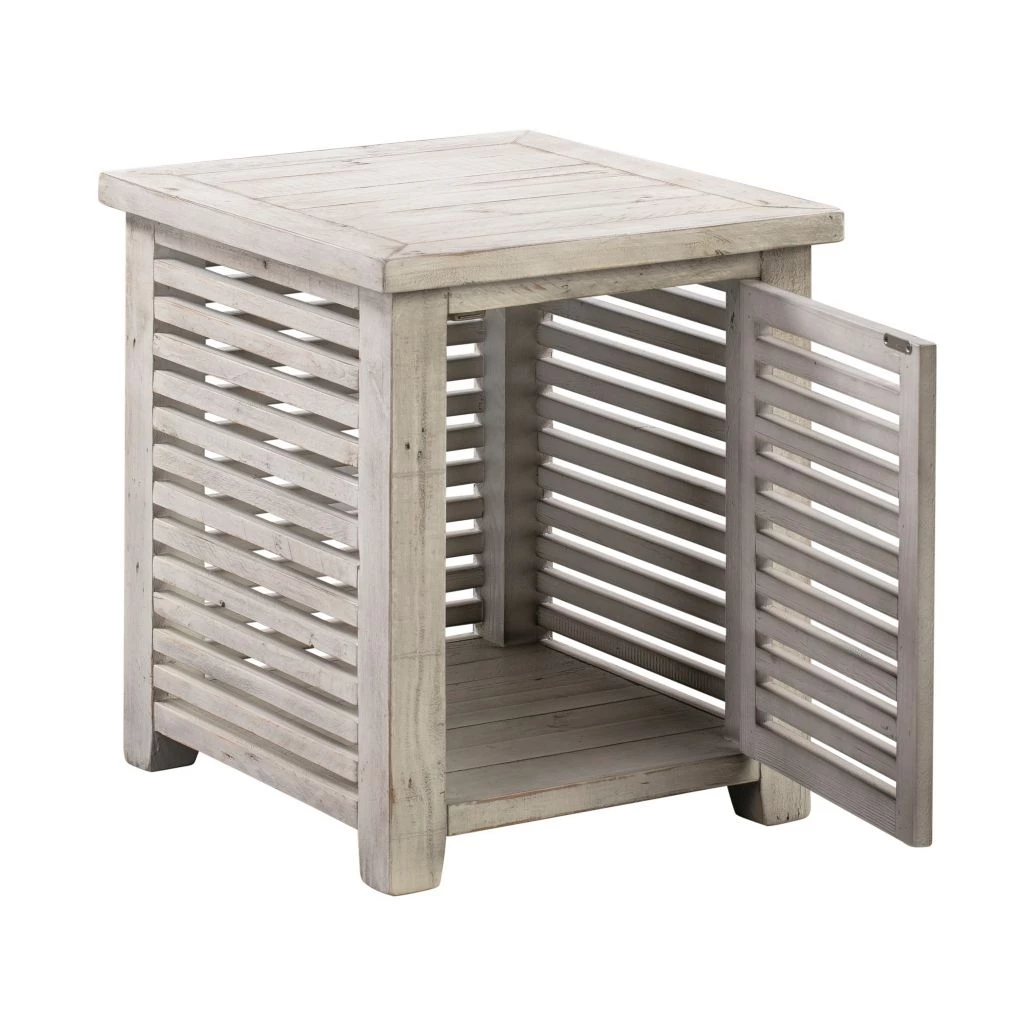 - Accent table features a slated design with a single door for concealed storage