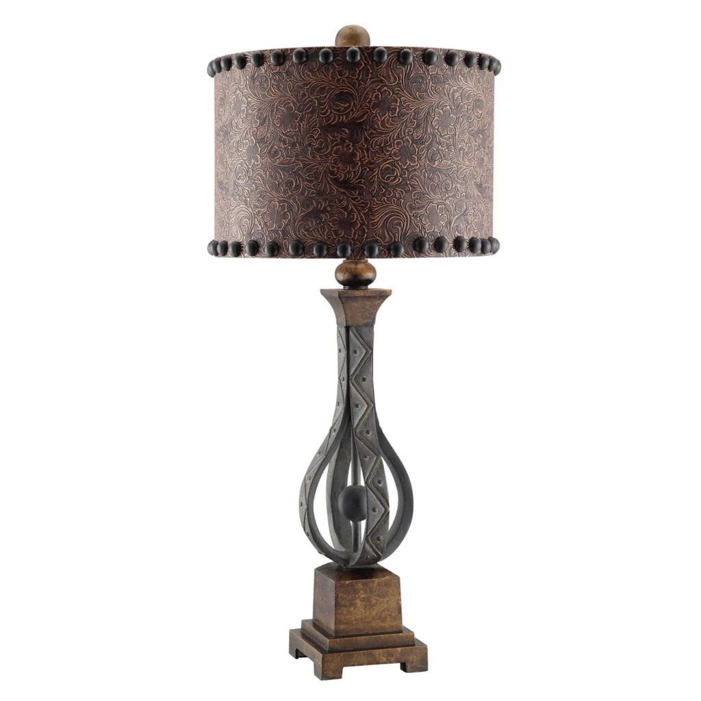 - Brown embossed shades with iron studs give these unique table lamps added flair