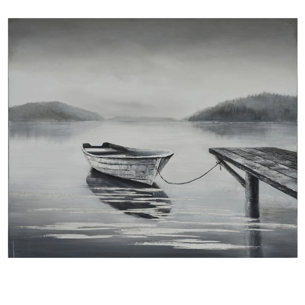- Depicts a row boat in solidarity with muted colors for a tranquil effect
